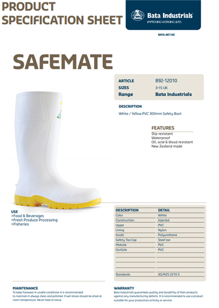Safemate white is an ideal boot for use in dairy, meat, fish or any food industry in which you need to keep your feet dry- This boot features a steel toe and the outsole is acid/oil resistant with a tread pattern designed with maximum slip resistance for indoor use